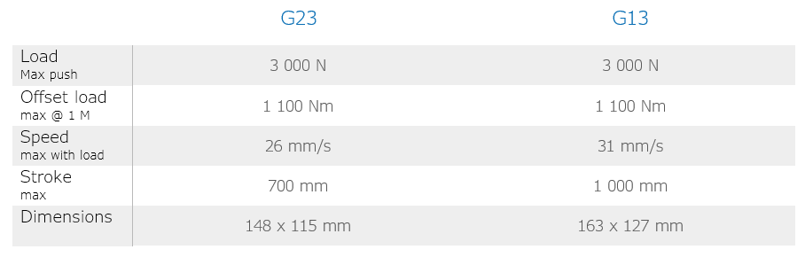 Our G-series is a small rectangular lifting column. It is developed for applications that needs a small and robust lifting solution to lift centric or offset loads. G-series are available as 2- or 3-section columns. With its stability and compact design, the G-series lifting columns are used in ergonomic workstations and to lift medical or industrial equipment.